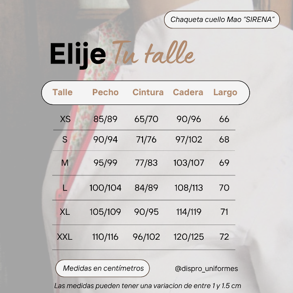Largo total: XS: 66 cm / S: 68 cm / M: 69 cm / L: 70 cm / XL: 71 cm / XXL: 72 cm
