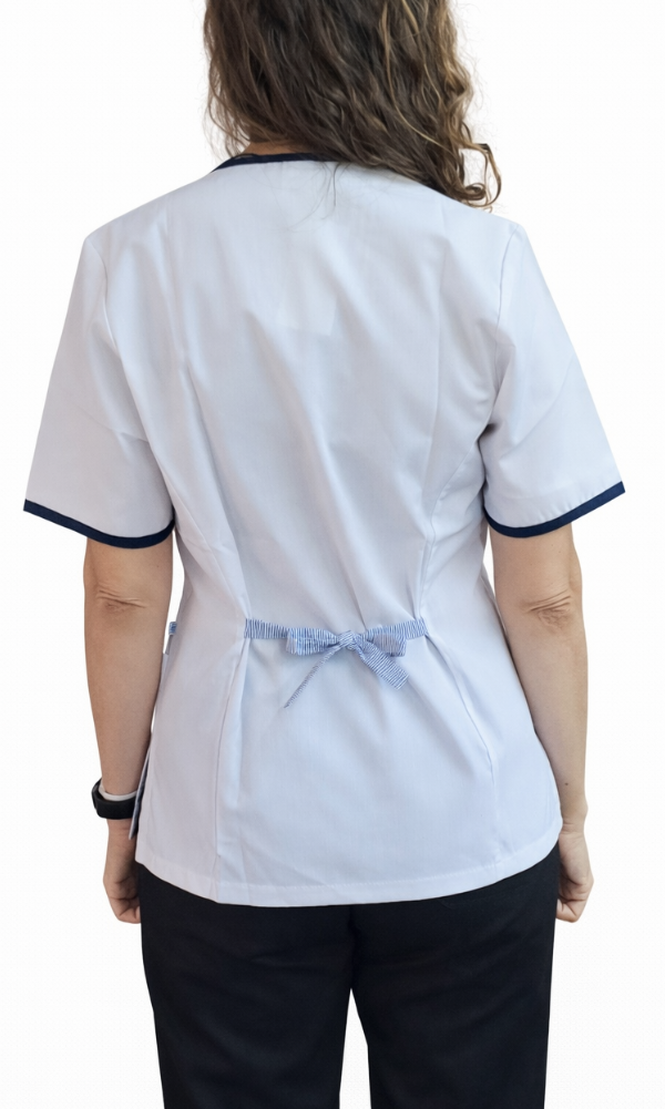 Chaqueta escote V asimétrica, mangas cortas, con vivos color, 2 bolsillos y tajos laterales.