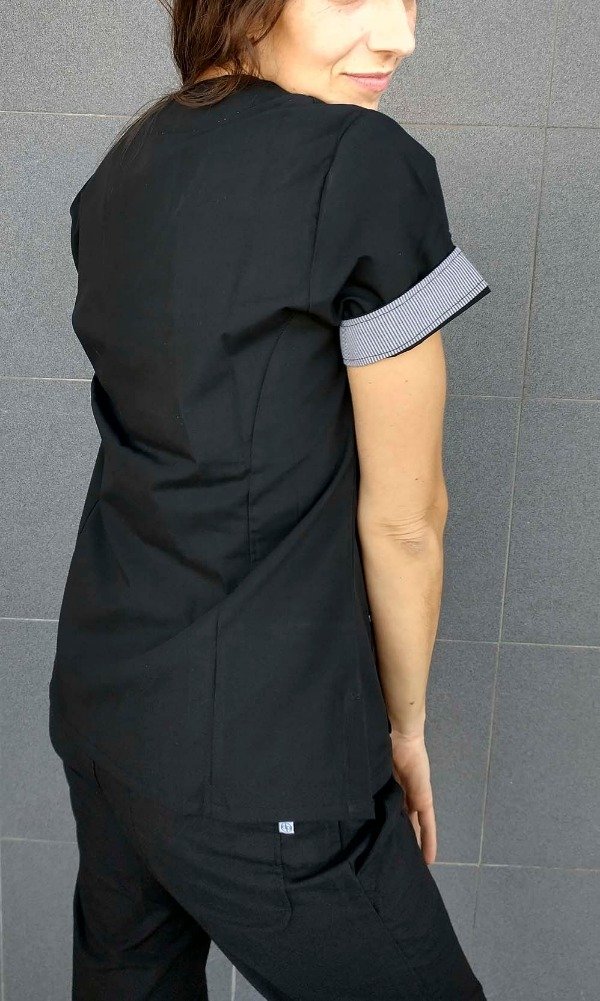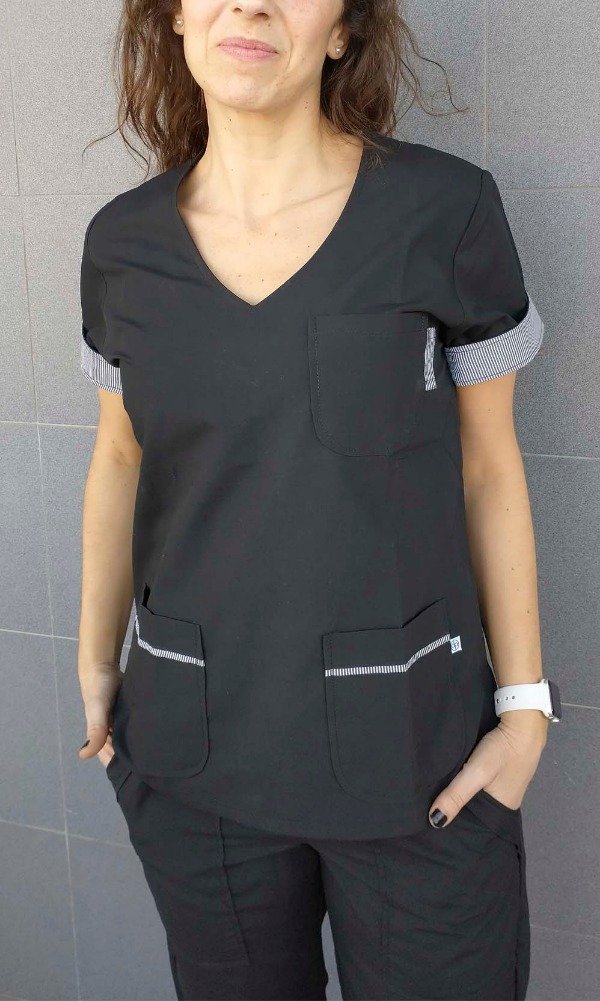 Chaqueta escote V mangas cortas, con vivos y vistas estampadas, 3 bolsillos y tajos laterales.